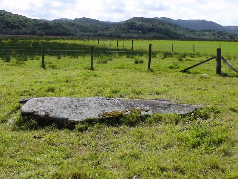 §16. SE from the Dun at a distance of 100 m is found a recumbent standing stone, 2 m wide and 3.5 m long, now packed at its south end with loose stones but which according to Canmore was still standing until recent times (upright in 1867; fallen by 1903). The two pictures (Figures 6 and 7) show the stone (i) from the S showing the Dun beyond and (ii) from the E. The stone is elevated above the angler's path along the river and is at a location that rises marginally from the surrounding land. As for Features 7 and 8, the land elevation drops towards the river W-E to a lower meadow.